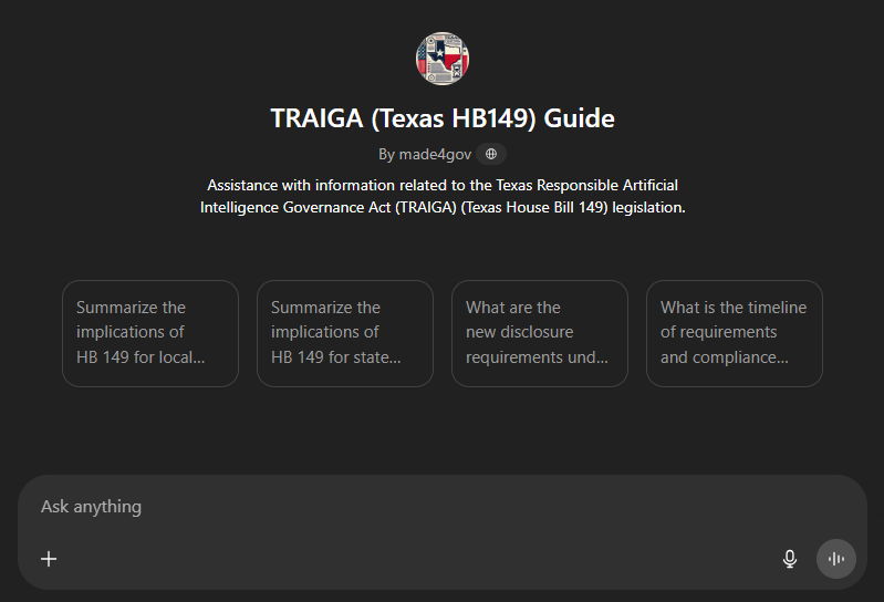 Access our custom GPT that can answer questions, help develop training, and provide additional information related to Texas AI legislation